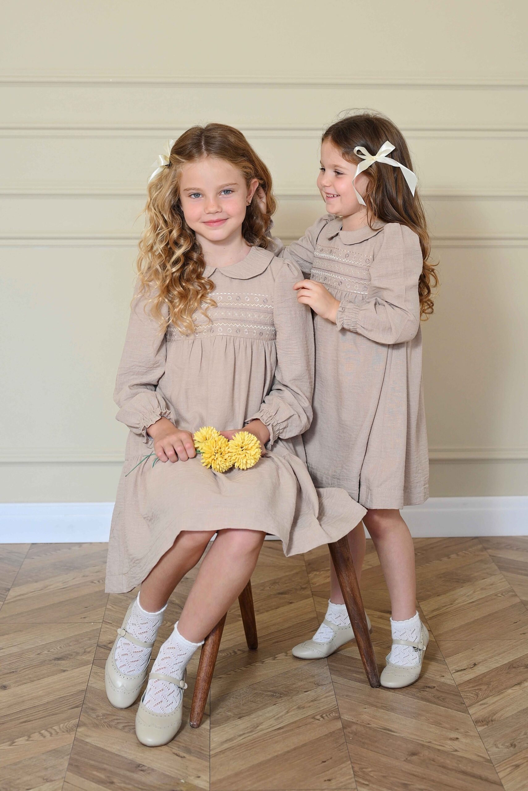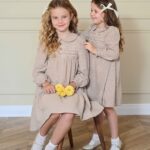 שמלת וינטז' ריקמה- חום בהיר מידות 6-20